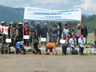 Kamis, 11 Juni 2015 Jam 09.15 Wib Kodim 0422/LB melaksanakan Tanam Perdana Padi dalam rangka Kegiatan UPSUS Kab. Lampung Barat TA. 2015 di hamparan sawah yang bertempat di Pekon Purawiwitan Kecamatan Kebun Tebu Kab. Lampung Barat yang dihadiri oleh + 150 orang terdiri dari Anggota Koramil 422-06/Sumberjaya, PPL Se-Kecamatan Kebon Tebu, dan masyarakat Tani Pekon Pura Wiwitan Kec. Kebun Tebu Kab. Lampung Barat.